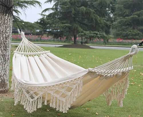 Canvas is a thicker type of cotton or linen fabric, named after its initial use in making ship sails. Hammocks made of canvas are known for their robust strength and incredibly comfortable lounging experience; even friends weighing 200 pounds can kick back without a worry. Moreover, they’re easy to clean and provide a really cozy spot to recline, though their breathability isn’t quite as top-notch.