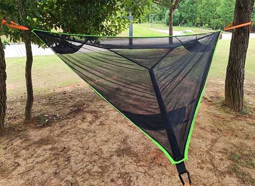 Nylon hammocks are fishnet-style ones. As a synthetic fiber, nylon is made from petroleum products. Tough and durable, it is tough, durable, and hard to mold and rot. With its lightweight feel, excellent breathability, comfort, and quick-drying capabilities, nylon is a common fabric for camping hammock manufacturing.