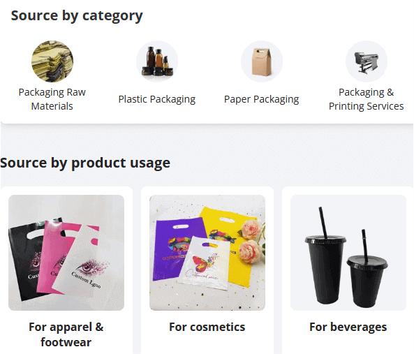 By searching for some keywords such as “packaging” on Alibaba or directly clicking Packaging & Printing, you will see lots of packaging styles and custom services. According to your needs, you can select an appropriate one by choosing material, product usage, certification, low MOQ customization, and other categories.